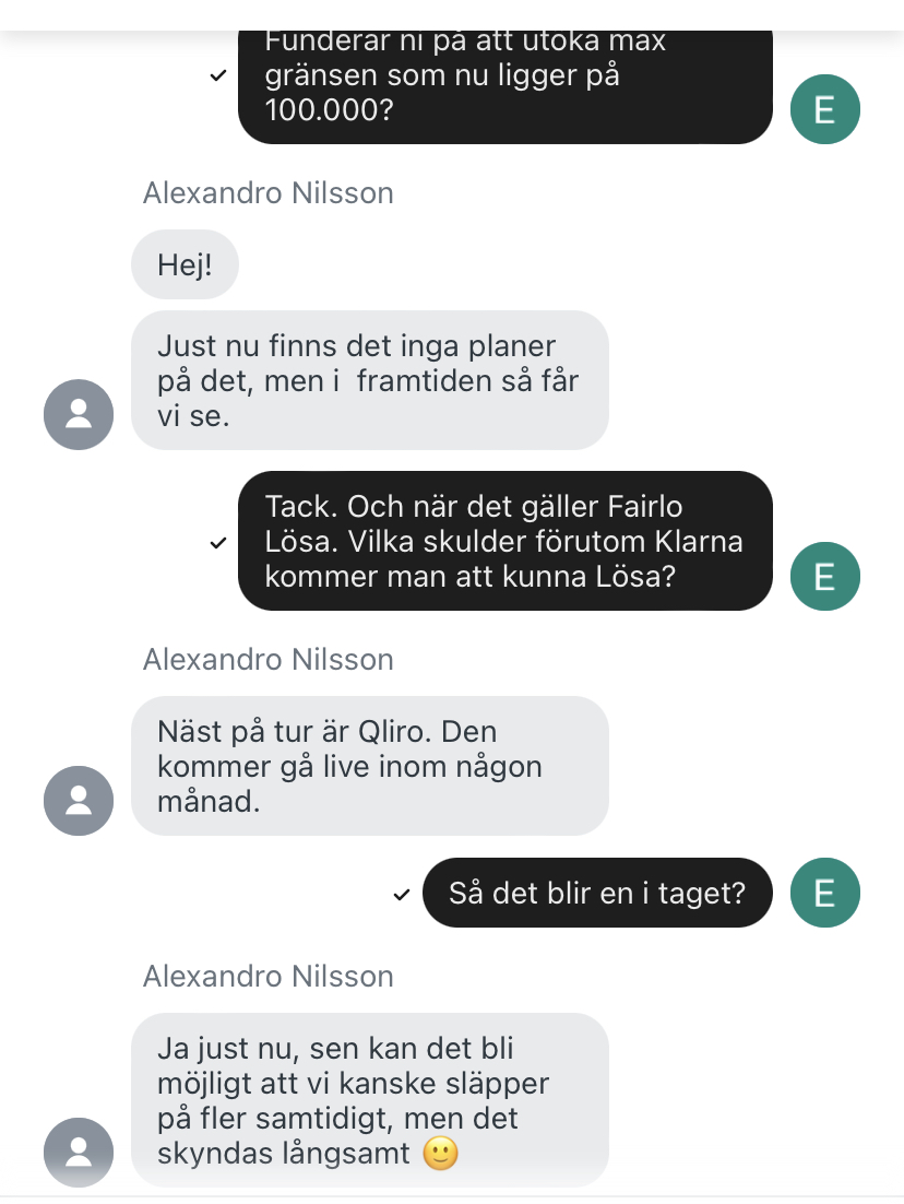 Jag har lösa och har inte fått sms och de skulle ju maila ut när detta gick live enligt deras kundtjänst. Tycker Fairlo gällande detta lösa borde vara mer konkret vad gäller, enligt dem skulle det gå ut ett mail när man kunde lösa in Qliro och har lösa sen tidigare och då borde vi alla som har det få ett sms. Känner att de nog misslyckats lite med information och kommunikation här och borde vara mer konkret vad de säger. Jag frågade dem för en vecka sedan och då sa de att de skulle komma ut med mail när Qliro funkade och lösa och när lösa gick live. Och har faktiskt mailat dem och svarat på de mailet de skickade för en vecka sedan. Här ser man hur viktigt det är att vara konkret i sin information och inte säga en sak och göra en annan och vet man inte så gå inte ut och ge förhoppningar innan man vet när det ska lanseras. Tycker tyvärr att Fairlo inte skött detta med lösa speciellt bra. Redan från början borde de sagt att de inte vet när det lanseras och om de ska lanseras igen för vissa eller för alla ?