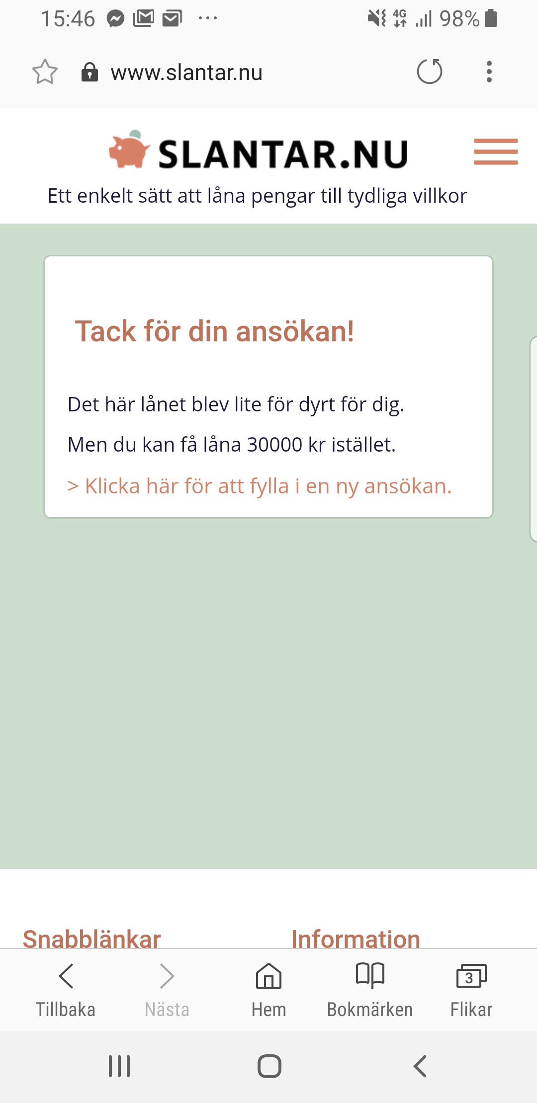 Detta fick jag när jag ansökte... det roliga är att jag har tidigare haft slantar återbetalade allt efter drygt 6 månader . Sökte på nytt lån med samma förutsättningar.. jag ringde dem och kollade varför sån svar?