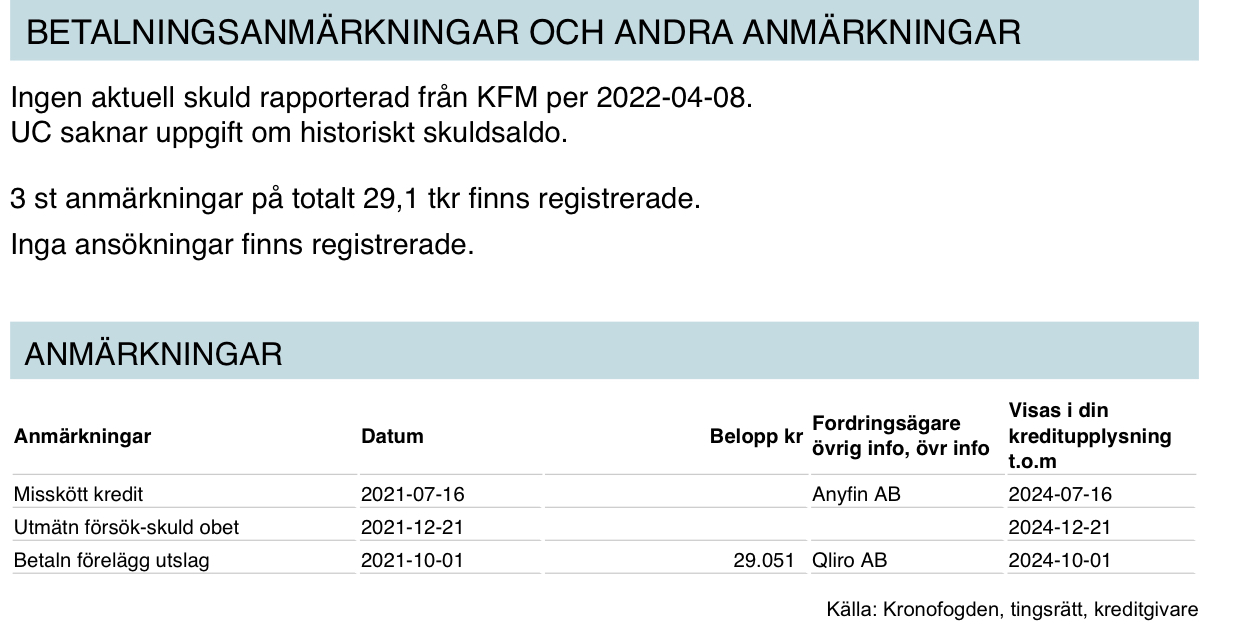 Idag köpte jag en egen UC och där står det att inga skulder finns