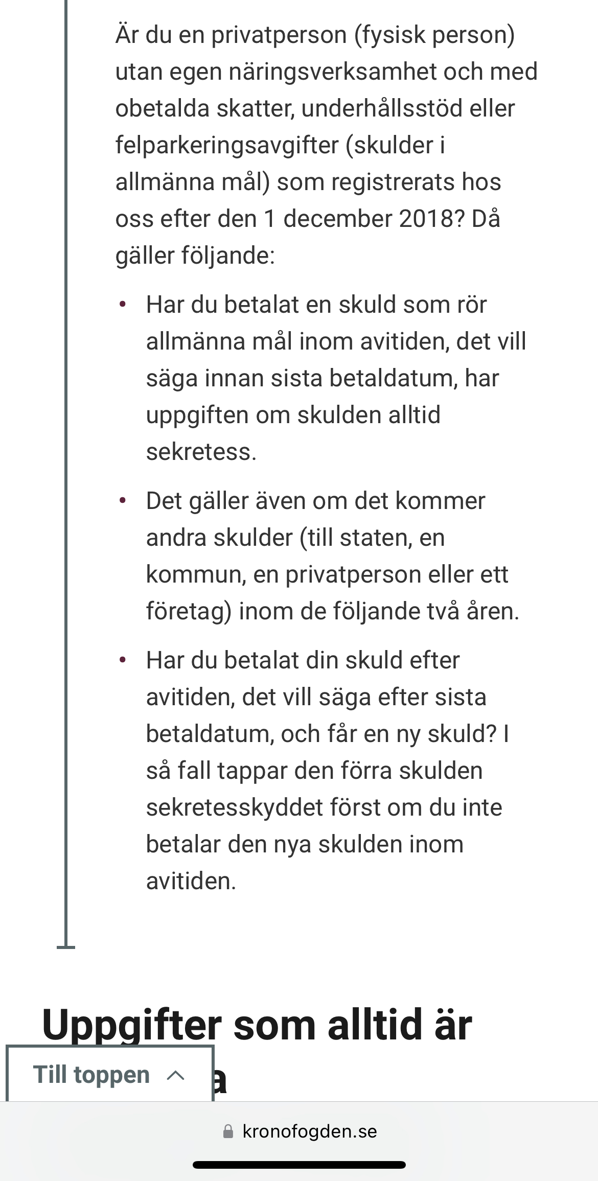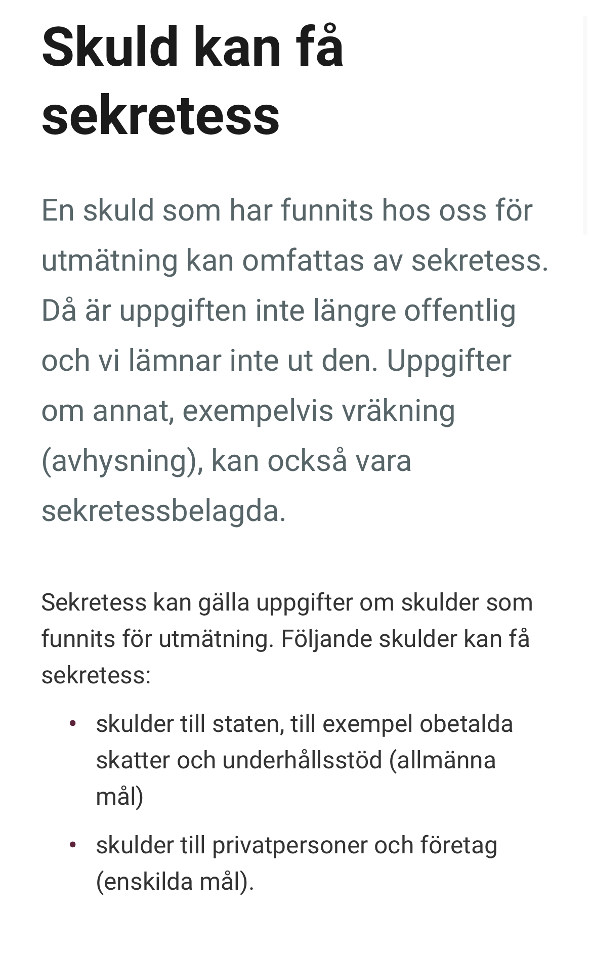 Eh. Va?Du kan vara lugn. Den kommer omfattas av sekretess vid utmätningen. Det blir automatiskt. Andra vissa skulder kan också omfattas av sekretess och kfm lämnar inte ut infon tex skuld till FK underhållsstöd osv