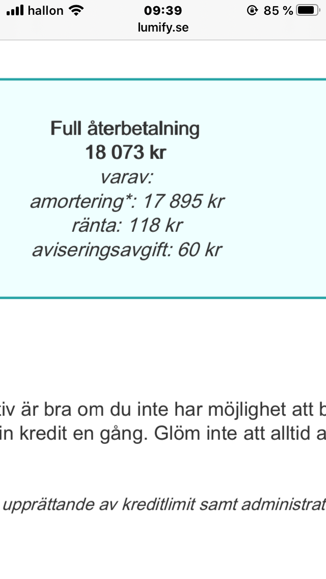 OKAY ännu värre. För det stod att jag kunde söka 8000 och då läste jag infon. Sen mitt under låne-processen/godkännandet så kommer det upp Något i stil med ”vi kan bevilja dig 16 000” inget om andra kostnader så dåligt. Skulle man då avbryta processen - fanns ingen anledning för mig att göra det då jag utgick från informationen som fanns vid ansökan - sedan ändrar dom under processen då borde de informera ngt typ ”obs läs villkor för den nya lånesumman innan du går vidare”. Sen hos andra så är det i princip billigare om man har högre lpn och Lumify de kör tvärtom o tar ut mer pengar istället.
