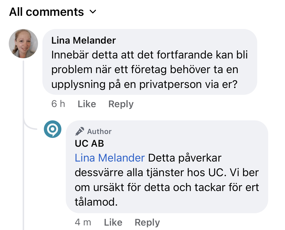20.00 var igår inte idag men det fortfarande nereVissa av UCs tjänster är för tillfället inte tillgängliga med anledning av ett driftproblem kopplat till en nedstängning hos vår IT-leverantör. Problemen ska vara åtgärdade och vår ambition var att starta öppnandet av våra tjänster igen ikväll runt kl 20.00. Vi planerar fortfarande för att öppna upp några få av våra tjänster ikväll. Vår avsikt är sedan att fortsätta öppna upp merparten av våra tjänster under morgondagen samt imorgon kväll.