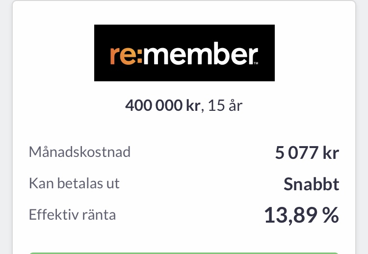 Så tog iväg en ansökan på lendo och advisa på max belopp på max tid. Fick bra erbjudan på remeber dock räntan på 14%. Hade behövts runt 200 tkr men fick erbjudan på 400 tkr. Slog till utan att vänta ut att alla banker. För ivrig. Men detta gör så att jag kan betala en utbildning samt få ihop några lån och få minst 3000 kr mindre per månad.