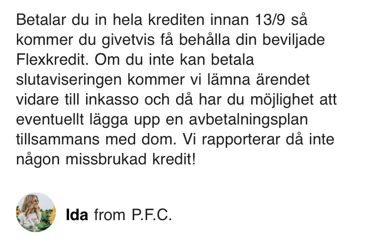Hoppas det gäller men samtidigt vet man inte när det står i avtalet man skrivit på att dem får göra det.När jag har fått detta på mejlen. Att dem INTE rapporterar missbrukad kredit. Då måste väl det ändå stämma? OM dem skulle rapportera missbrukad kredit måste jag väl kunna dra det vidare när jag har fått det skriftligt att dem ej ska göra det?