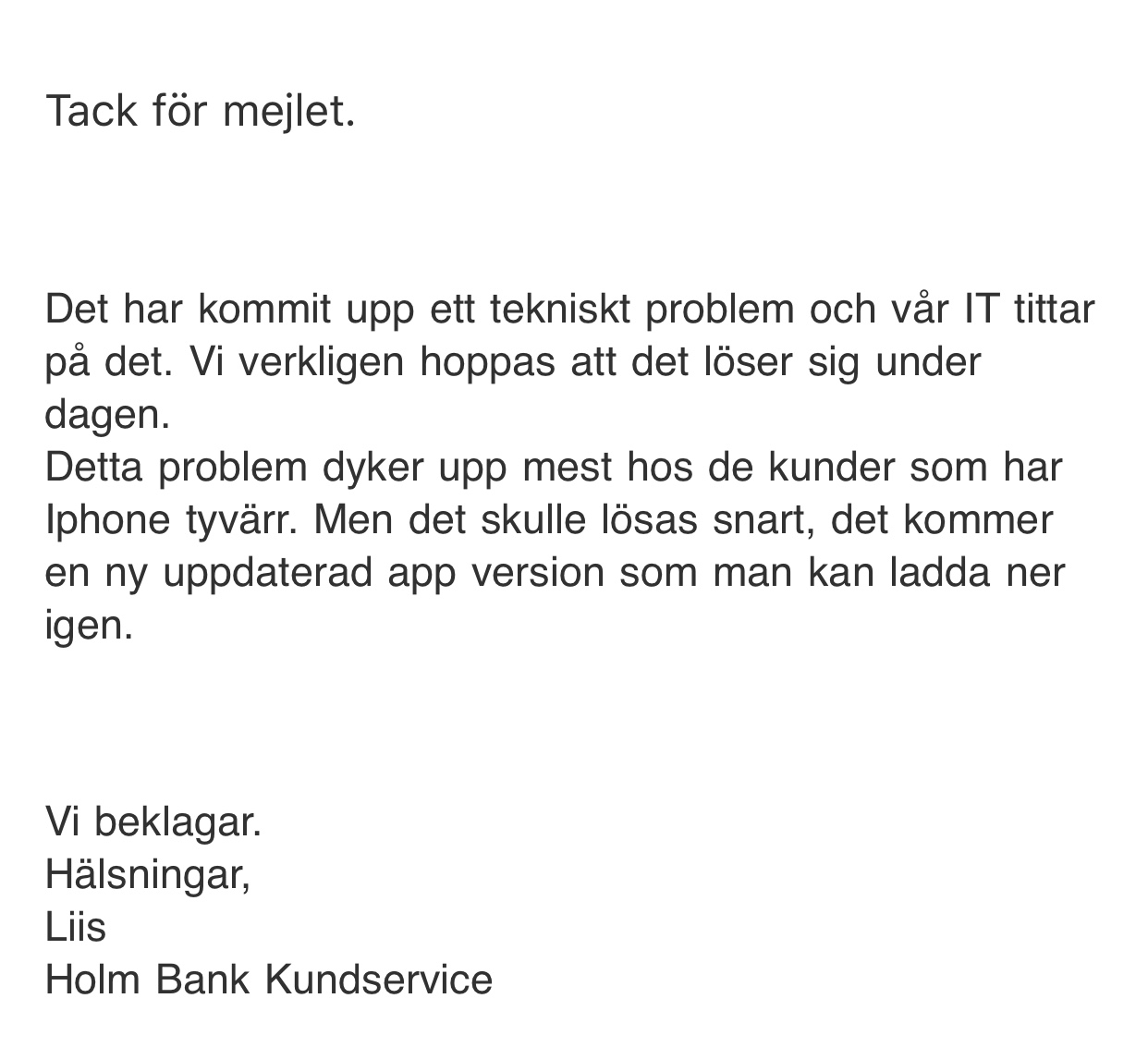 Fick svar gällande att det inte fungerar för mig med Iphone ” Det har kommit upp ett tekniskt problem och vår IT tittar på det. Vi verkligen hoppas att det löser sig under dagen.