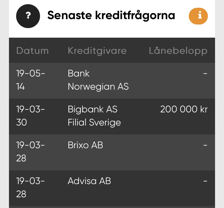 Alltså jag sökte på advisa fick i GA erbjudanden. Sökte då separat på BN och blev godkänd. Sen har det varit lite fram och tillbaka med div dokument och nu fick jag lånet. Men möjligt att det är för det gått mer än 30 dagar.Hur var det, du sökte via förmedlare och fick avslag. BN kanske tog en upplysning då. Hann det gå en månad till då du fick pengarna/lösta lån. Då kanske dem tog upplysning igen för att det var mer än 30 dagar. Låneansökan gäller i 30 dagar.